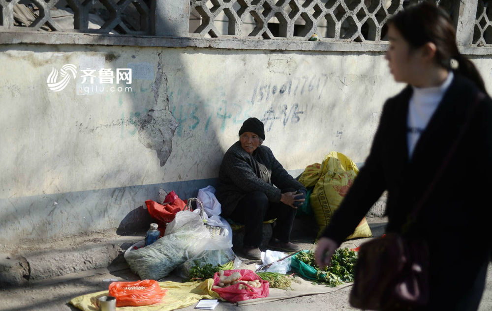 2017年03月08日,山东省济南市,70多岁的赵殿香挑着六七十斤重的扁担,从南部山区到市区卖农货,来回近60公里,这条摆摊路,赵老太已经走了8年。