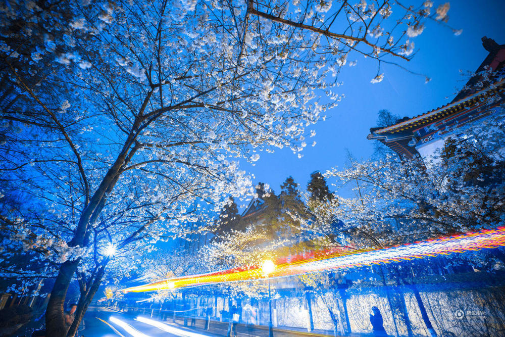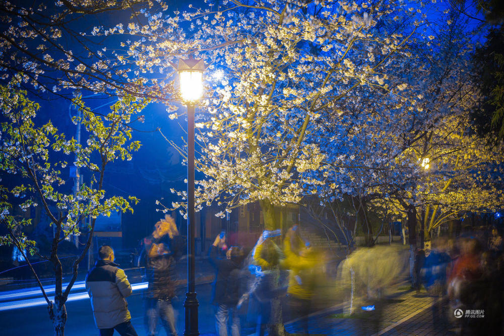 2017年3月20日,江苏省南京市,时值春分,南京鸡鸣寺路两旁盛开的樱花在夜色和灯光的衬托下更显浪漫精致,吸引众多游客前来赏夜樱。苏阳/视觉中国