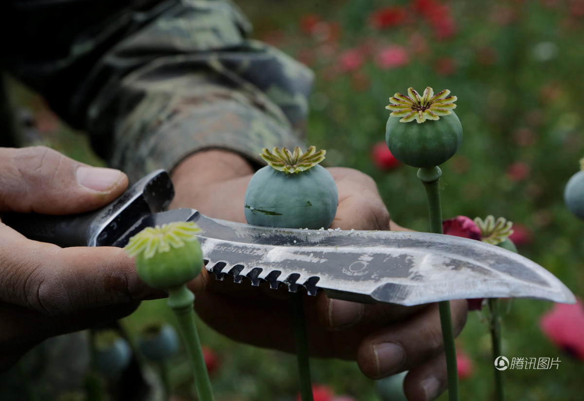 士兵割开罂粟果,果汁渗出的汁液可以制作鸦片,经过进一步提纯便是海洛因。