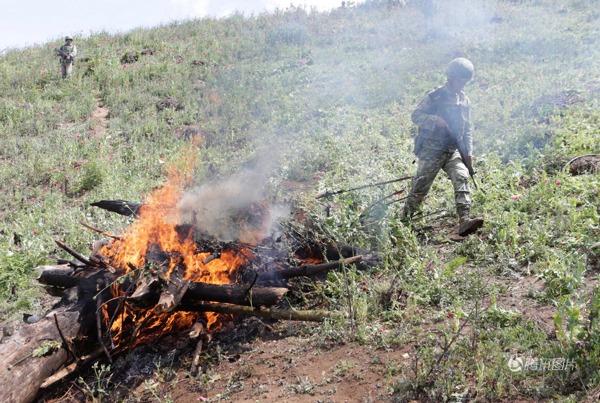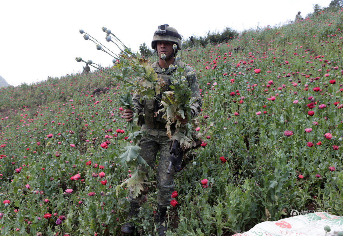 士兵将罂粟铲除。美国的海洛因使用量在过去十年中上升了五倍,成瘾增加了三倍,白人和低收入男性是主要的瘾君子。
