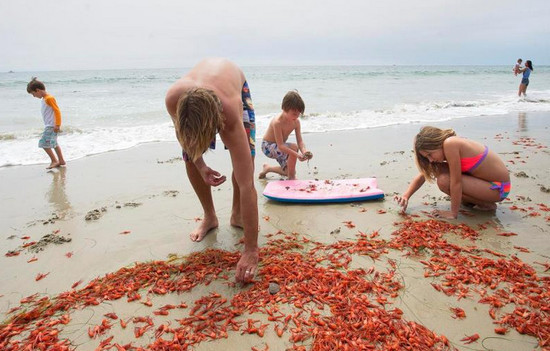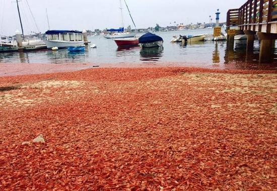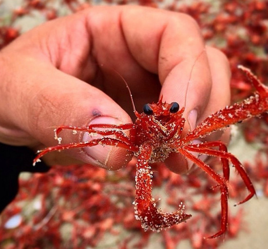 这一幕发生在加州的南海附近,正片沙滩都被密密麻麻麻的小龙虾覆盖。