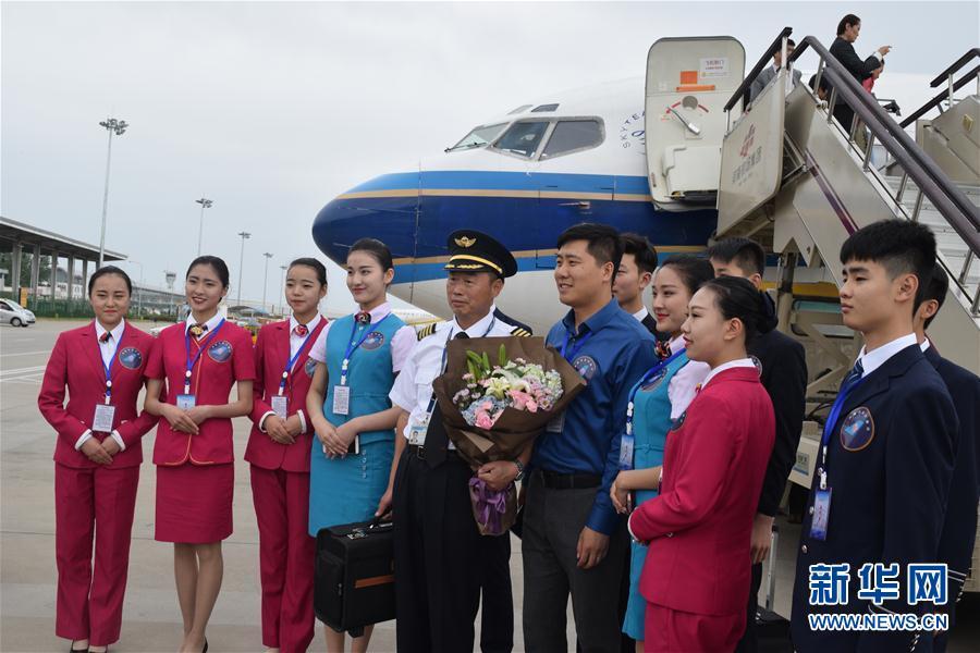 执飞最后一班航班的飞行员、空姐等在编号为B-2959的波音737-300型客机前合影。