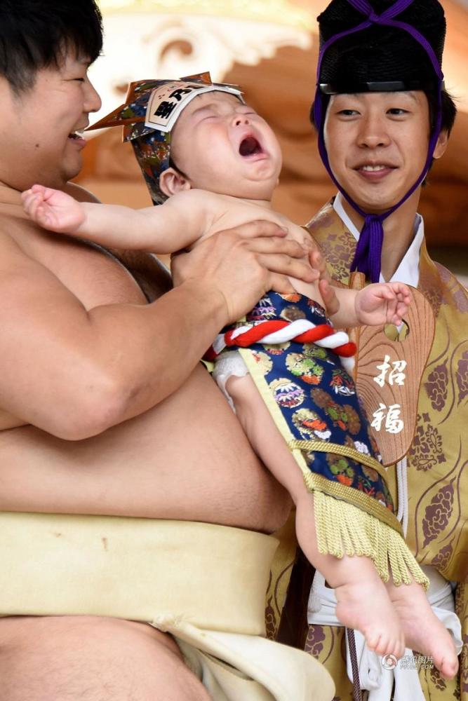 当地时间2017年5月14日,日本神奈川,相扑选手抱着宝宝参加“婴儿啼哭大赛”。150名两岁以下的婴儿参加了这场年度比赛。视觉中国