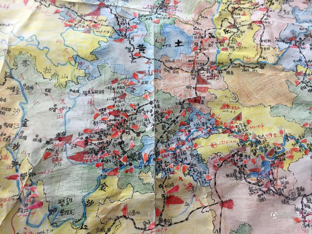 收工后,张继文还要到处转转,捡一点废弃的材料,或者去山顶上修好的路那边,清理行人乱丢的垃圾。除了森林里修的两条路,张继文还走了大部分人走不了的万千条路,这些路,在他亲手绘制的100多张地图上,用小红旗一一标注。张继文有一个绰号叫“长江之哥”,除了长江源头沱沱河准备今年去,整个长江流域,他和老伴已经用16年“跑”完了——他跟着沿江的国道跑,汪蓝英坐大巴到下一站等他。这个时候,耳朵和眼睛才会分开。
