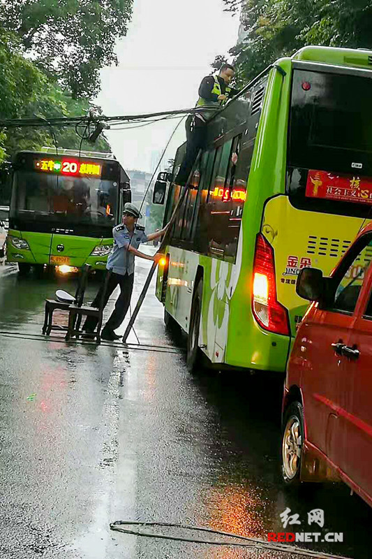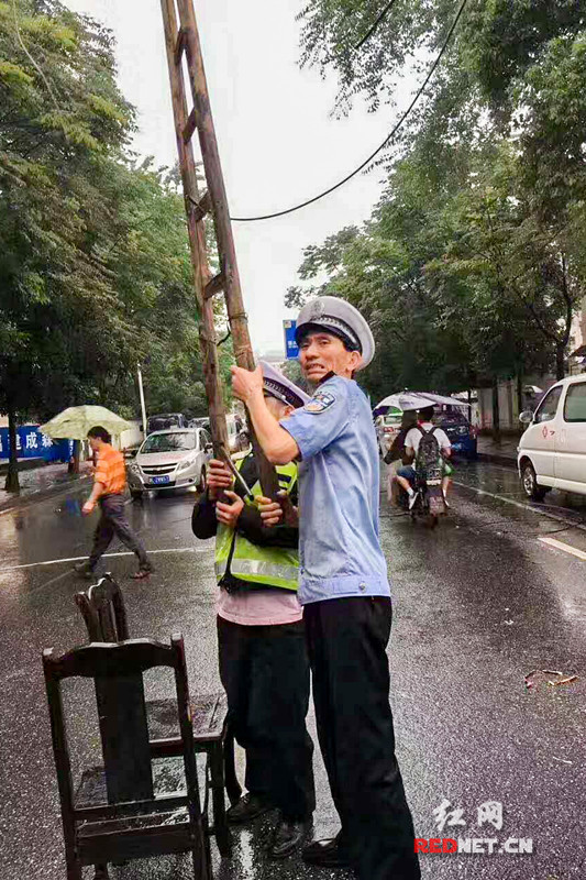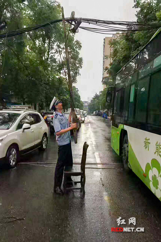 最早赶到现场的交警曹志斌,找来凳子和扶梯,冒着漏电的危险,把电缆高高举起。这一举,就是一个多小时。曹志斌全身已经湿透。