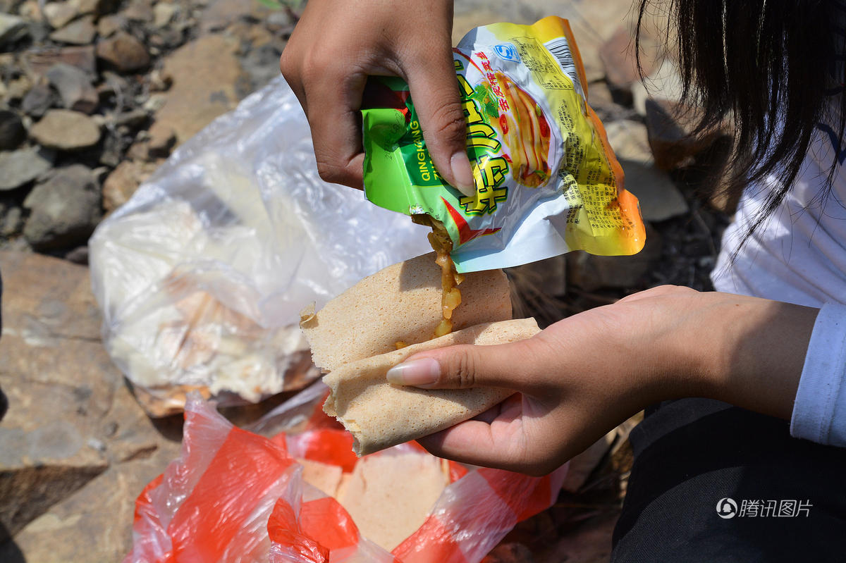 弟弟孙冰杰饿了,他们拿出煎饼放上一点咸菜,吃了起来。