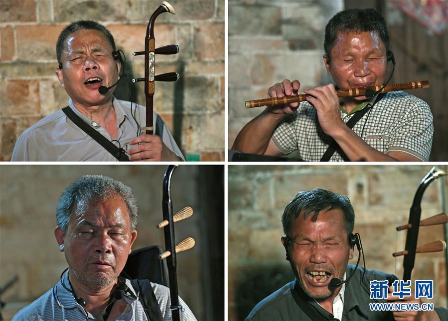 左上:盲人曲艺队队长陈锁生在表演道情;右上:盲人曲艺队队员左仁明在表演道情;左下:盲人曲艺队队员喻金根在表演道情;右下:盲人曲艺队队员李泉典在表演道情(拼版照片,5月18日摄)。
