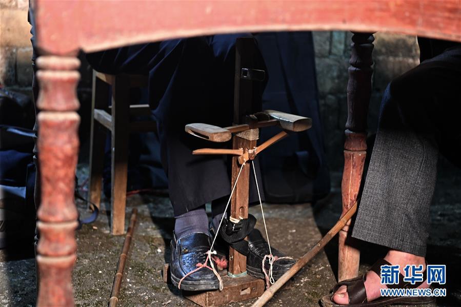 “以往,曲艺队员一年中就有200多天在乡下演出。有车坐车,没车走路;吃派饭,睡通铺;白天赶路,晚上演出;人没到村口,村子里就放鞭炮。”65岁的曲艺队队长陈锁生说起往事,深有感慨。图为陈锁生用自制的“脚踏木鱼”伴奏(5月18日摄)。