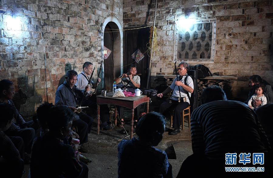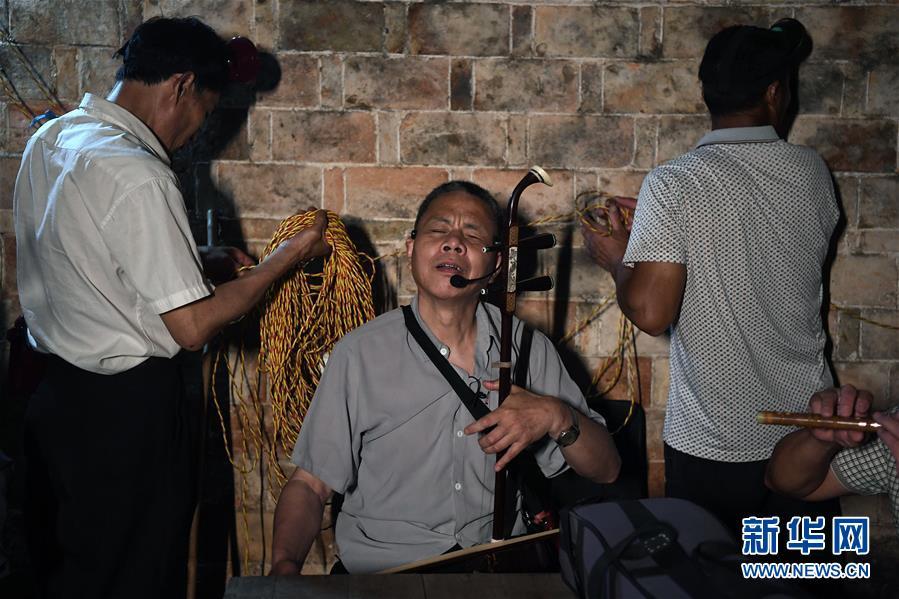 盲人曲艺队在上高县徐家渡镇万坑村的一座老屋前表演道情(5月18日摄)。