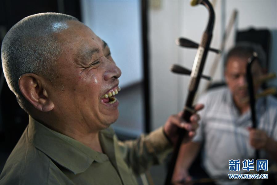 在上高县文化馆,张邦灶(左)在参加排练(5月18日摄)。因为腿脚不好,张邦灶已经不能下乡演出了,但就算和老伙计们一起排练,他也是声情并茂,十分投入。