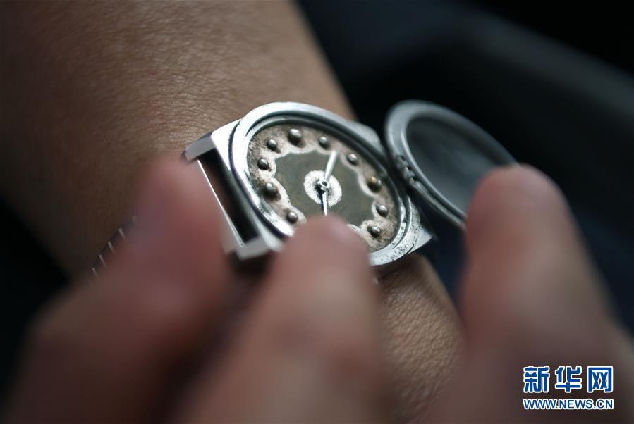 陈锁生用跟随他多年的盲人手表掌握时间(5月18日摄)。