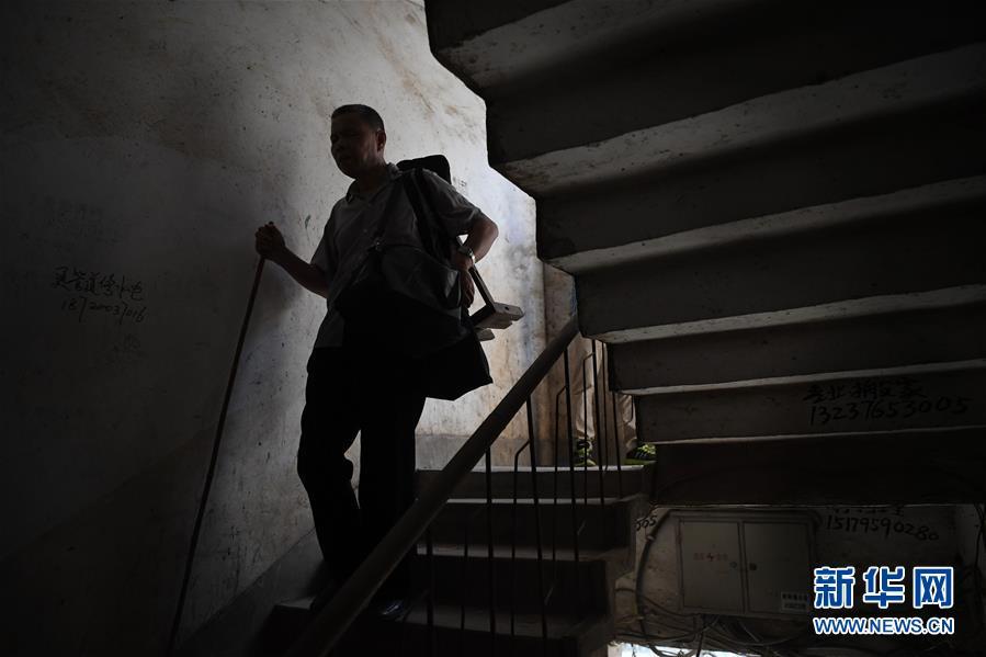 拿盲杖,肩背二胡,离开位于上高县县城的家,踏上下乡演出之路(5月18日摄)。