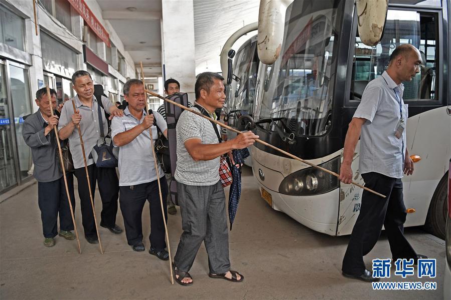 在上高县客运西站,工作人员(右一)牵引盲人曲艺队队员登上长途汽车(5月18日摄)。