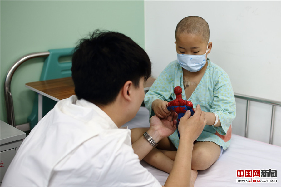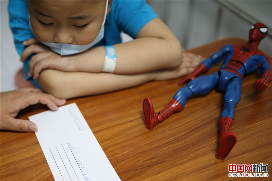 5月24日,季长绪给天佑一个蜘蛛侠玩具。刚入院时一天要抽血数次,给年幼的天佑造成阴影。“他天天就想着这个事,经常说‘妈妈,我是不是还要抽血?’”天佑的母亲海燕说。看到孩子的低迷,知道天佑喜欢“蜘蛛侠”的季长绪,给孩子送了这个玩具,希望能鼓励他勇敢接受治疗。