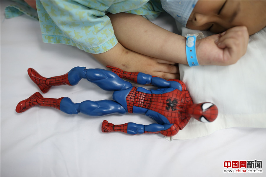 5月24日,天佑把“蜘蛛侠”玩具放在身边,躺着睡觉。天佑得的是急性淋巴细胞白血病B型,这种类型的白血病治愈率很高的,有六七成把握。随着医学发展,白血病已经不是不治之症,通过化疗、造血干细胞移植等治疗措施,80%-90%的儿童白血病可以缓解,60%-70%的可以治愈。