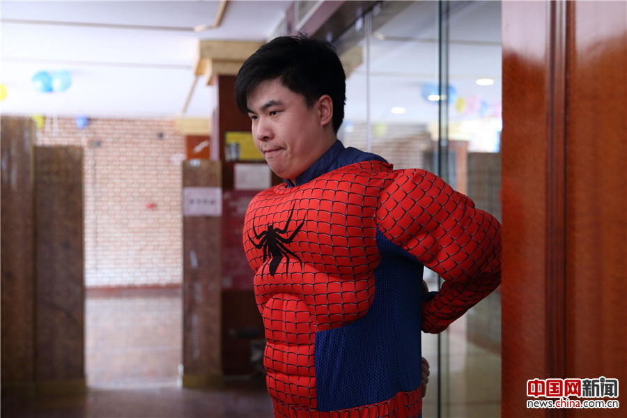 5月26日,北京首都儿科研究所,季长绪扮演“蜘蛛侠”。季长绪是首儿所医院手术室的第一批男护士之一,已成为手术室的技术骨干。当天,医院为白血病患儿举办了“你是我的英雄”儿童节公益活动。