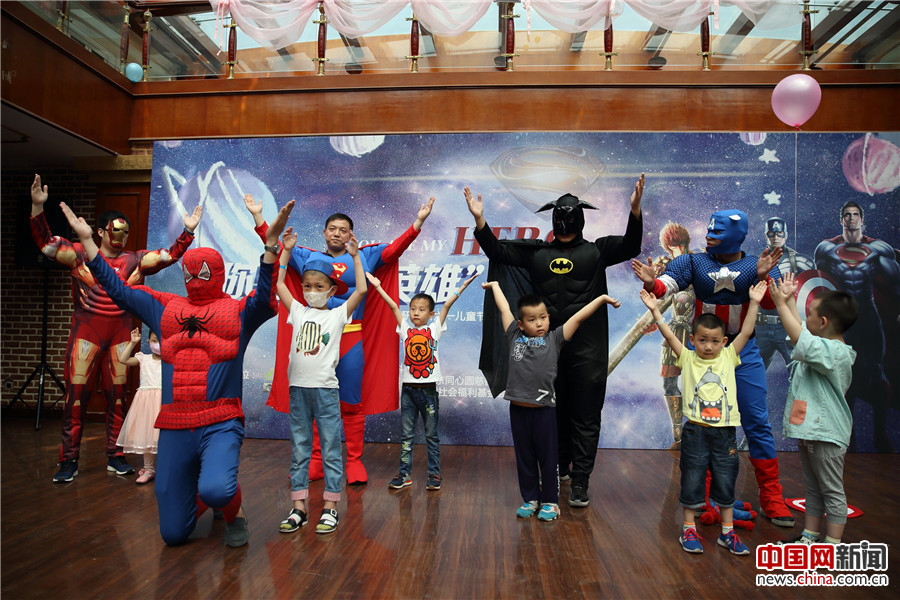 5月26日,北京首都儿科研究所,男护士季长绪扮演的“蜘蛛侠”和众“动漫英雄”与医院住院患儿一起演出。天佑因治疗难受,没法到活动现场。