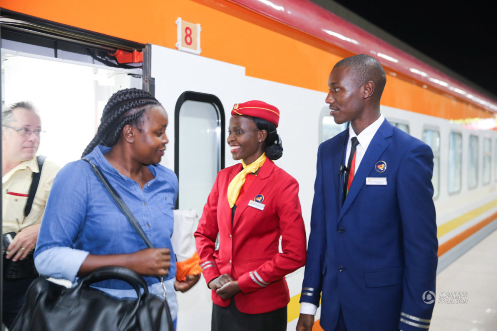 图为5月29日,在肯尼亚蒙内铁路蒙巴萨西站,两名列车员站在车厢门口指引试乘旅客下车。新华社记者潘思危摄