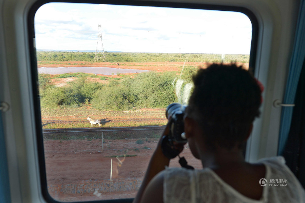 蒙内铁路穿越肯尼亚野生动物保护区等环境敏感区域,中国路桥在选线设计时合理利用既有交通走廊,让大部分路段与既有铁路贴近并行,以最大限度减少对生态环境以及野生动物的影响。图为5月29日,一名女性在开往内罗毕的列车上拍摄外面的斑马。TONY KARUMBA/视觉中国