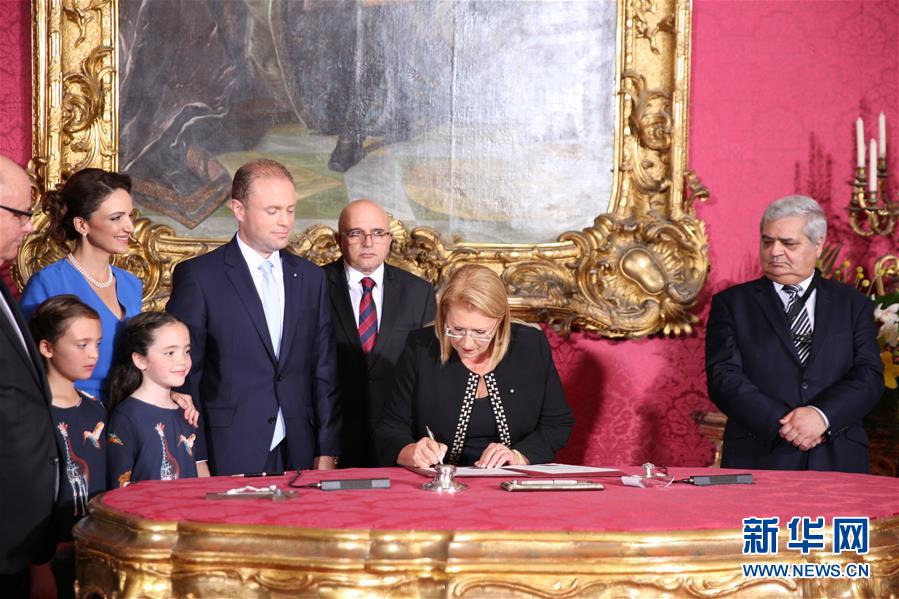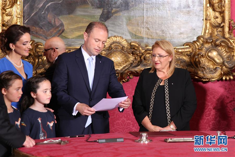 6月5日,马耳他总理穆斯卡特(右三)在瓦莱塔宣誓后与总统普雷卡(右一)握手。马耳他大选官方统计结果5日揭晓,马耳他工党在大选中胜出,工党领袖穆斯卡特当天宣誓就任总理。