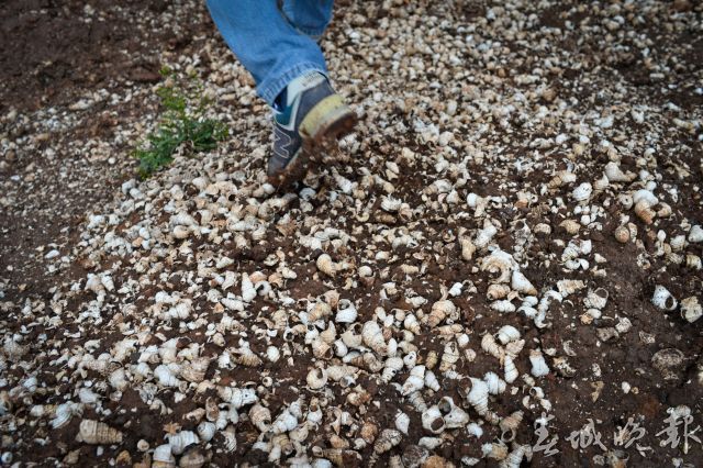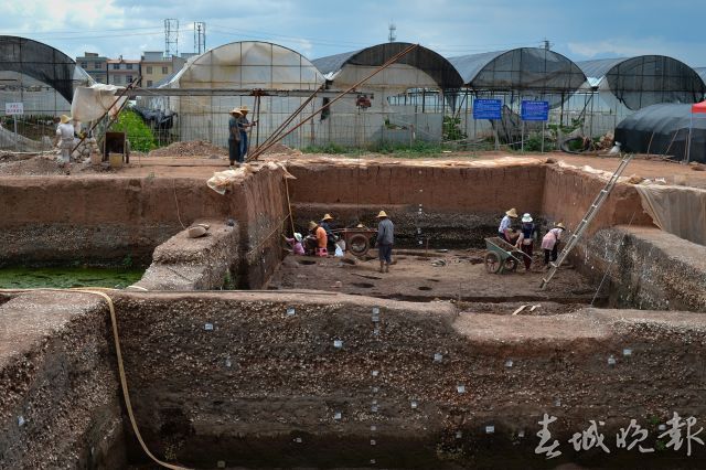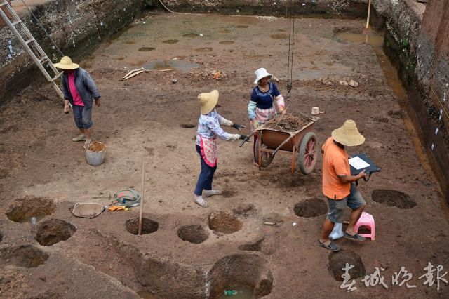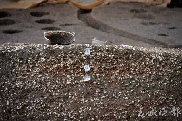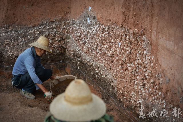 近日,记者来到晋宁区上蒜镇上河西遗址考古发掘现场。通往考古发掘现场的路上,满是挖出来的螺蛳壳。现场挖出来好几个大坑(探方),十几名工作人员正在两个坑里挖土、测量、记录,升降机不断把土方从坑里运上来;还有两个大坑积了很多水,挖掘时间应该更早了。坑与坑之间的埂上也布满了螺蛳壳。
