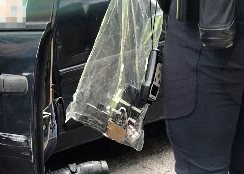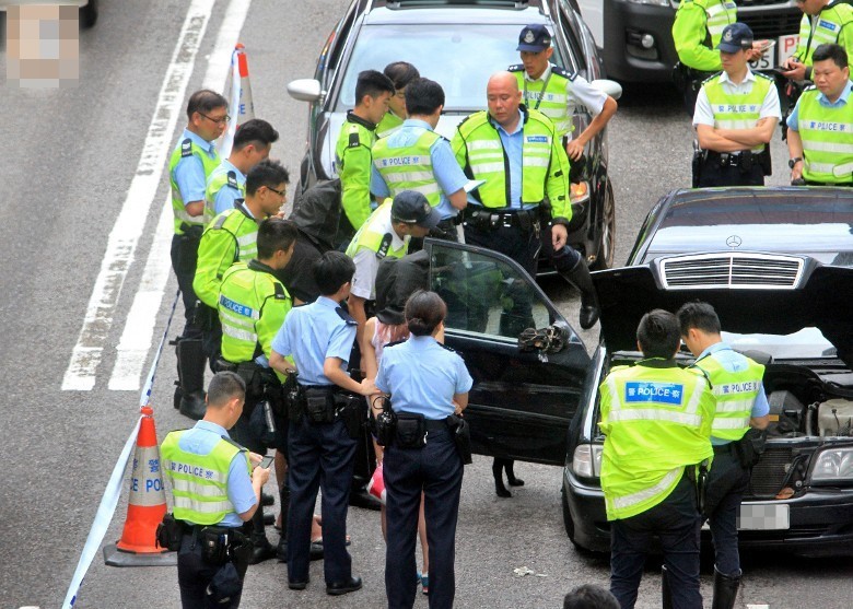 最终,超过13辆警车赶到现场,将该车重重包围。警方拘捕了男司机及女乘客,两人被黑布蒙头及锁上手铐,在现场协助调查。