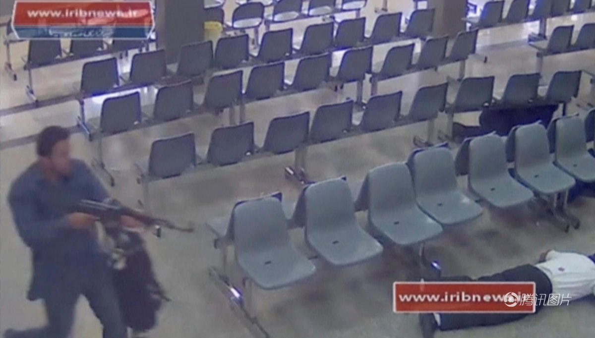 当日上午,4名武装分子闯入伊朗议会大楼,无目标的随意开枪射击,其中一名袭击者还在议会大楼4楼引爆身上的爆炸装置。图为事发后,伊朗官方公布的监控视频。