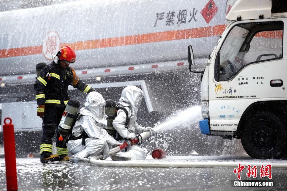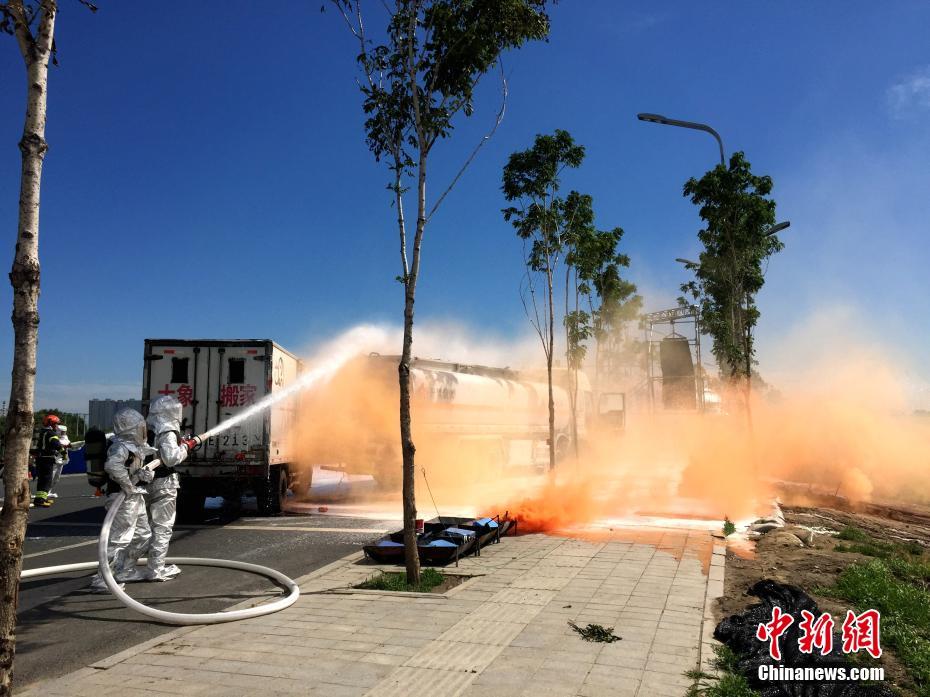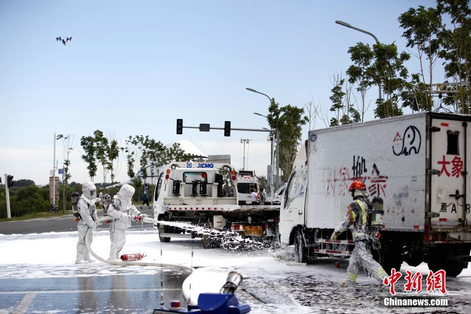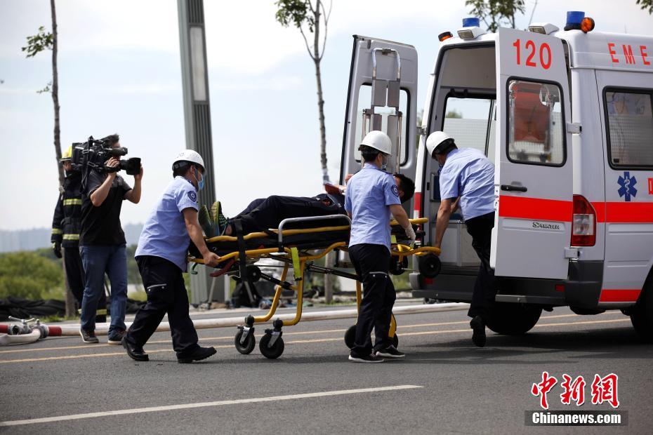 7月12日,哈尔滨举行历史首次大规模突发事故应急救援综合演练,抢险车辆、水上救援船纷纷出动。据了解,本次演练中,模拟了运输危险化学品车辆发生交通事故,出现人员被困、危险品泄漏起火,江水、空气、土壤受到污染后,各部门间衔接配合组织救援的过程。中新社记者 钟欣 摄