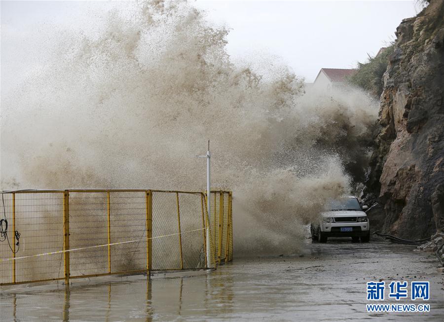 9月14日,在浙江温岭石塘镇,大风掀起巨浪涌向岸边。