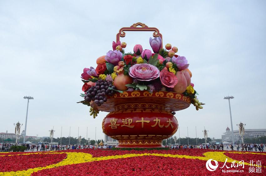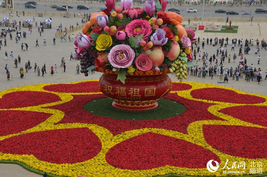 据了解,今年的大花篮以喜庆的花果篮为主景,篮内摆放着柿子、石榴、苹果,以及牡丹、玉兰、月季等,寓意十八大以来,党和国家在各个领域取得的辉煌成就,硕果累累。底部花坛采用心形图案,寓意红心向党,表达对祖国繁荣富强、欣欣向荣的美好祝福。花篮顶高17米,篮体高15.3米,底部直径达50米。篮体南侧书写着“祝福祖国,1949-2017”字样,北侧则书写着“喜迎十九大”字样。