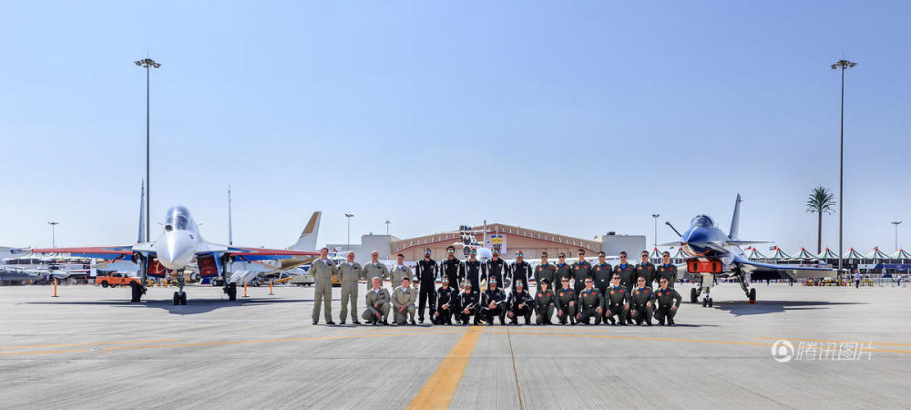 11月13日,中国空军八一飞行表演队及歼10战斗机(右)、阿联酋骑士表演队及MB-339教练机(中)、俄罗斯勇士表演队及苏30战斗机(左)在阿联酋迪拜航展合影。此次航展,中国空军女飞行员陶佳莉驾驶歼-10表演机参加了表演,在海湾上空首次留下了中国空军女战斗机飞行员的航迹。摄影:余明