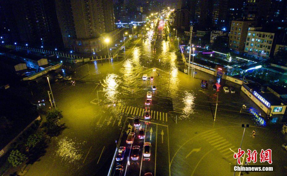 当天,海口市气象台发布消息,海口市北半部地区3小时内降雨量已达100毫米以上,暴雨橙色预警信号为暴雨红色预警信号,且降雨将持续。多条路段积水内涝,严重影响当地交通和市民出行。图为航拍海口市红城湖路积水严重路段,车辆冒险涉水通行。中新社记者 骆云飞 摄