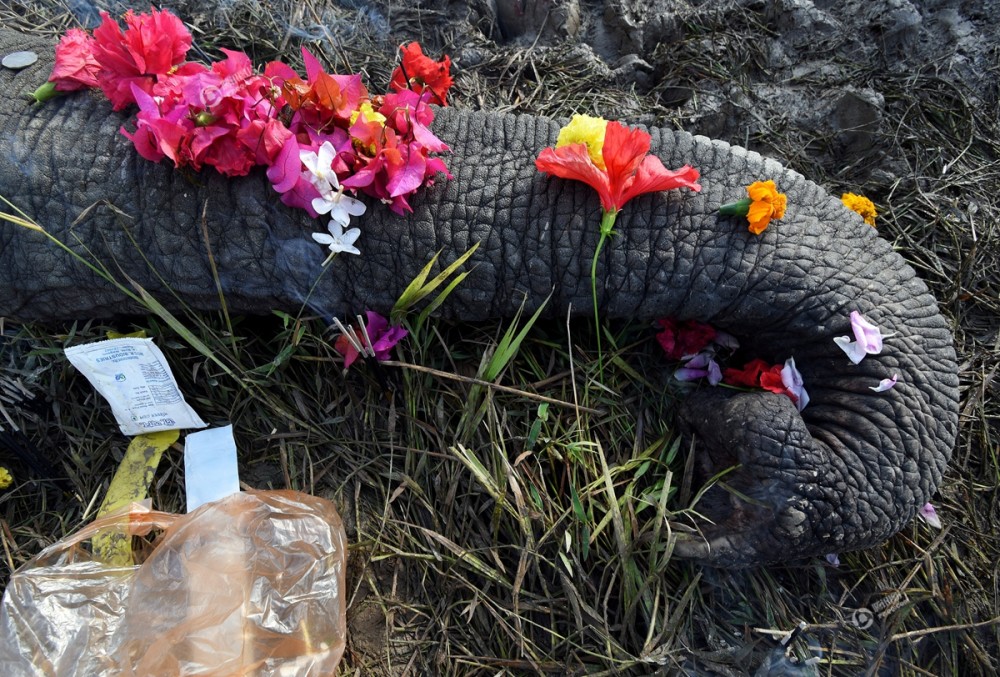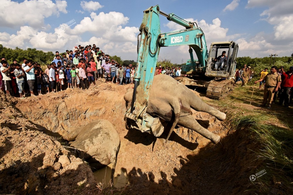 当地时间2017年12月12日,印度阿萨姆邦Nagaon,民众围观两只大象的尸体被掩埋。当天早晨,两只大象在当地稻田触电死亡。