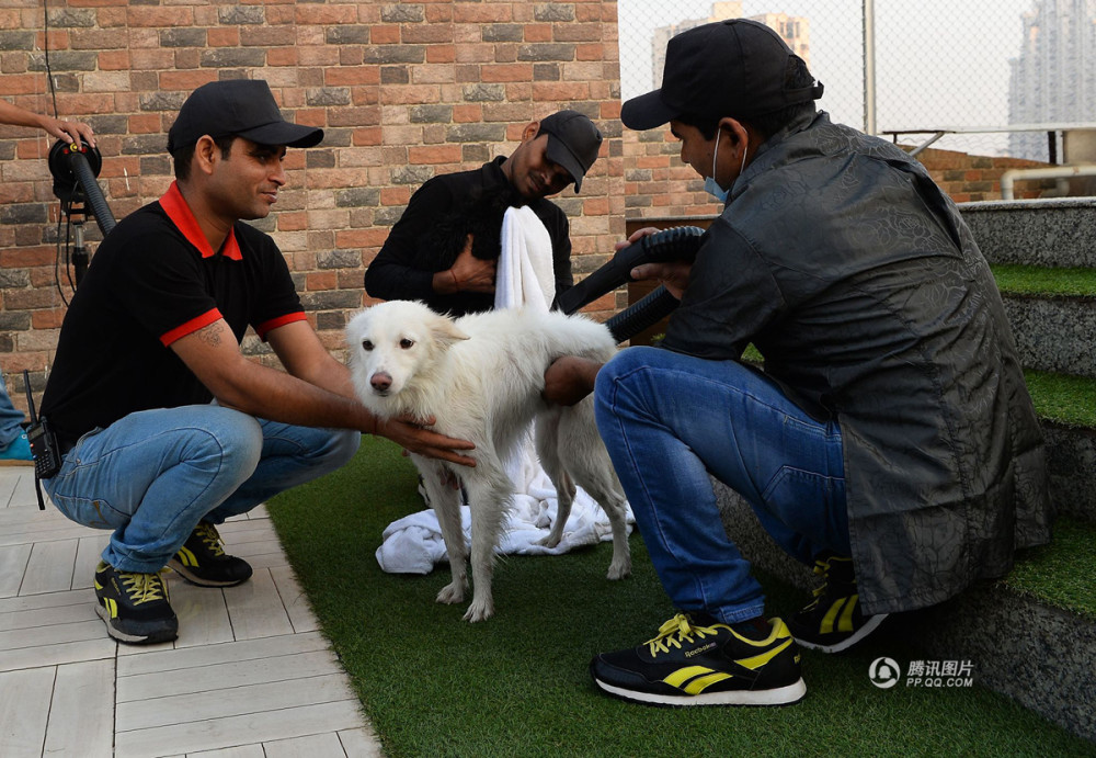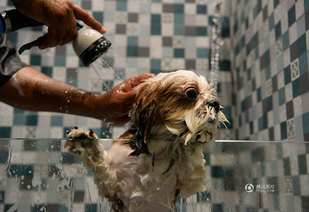 这家宠物酒店每晚70美元,狗狗们就能享受天鹅绒大床,一台电视,甚至还有通向阳台的专属狗门。图为一名员工为狗狗洗澡。
