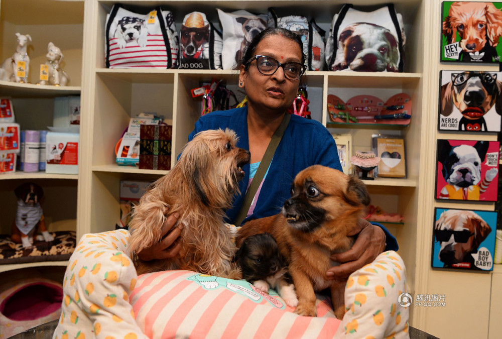 Veena Patel抱着自己的宠物狗在Critterati奢华宠物酒店内接受记者访问。