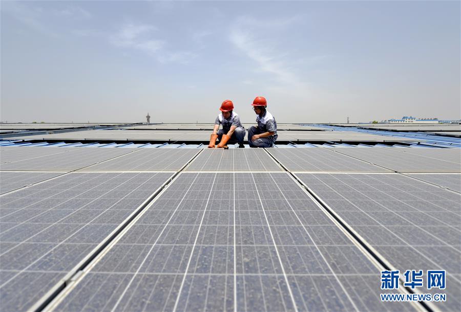 工作人员在河北省沙河经济开发区德盛工业园屋顶分布式光伏电站检修光伏板(6月11日摄)。