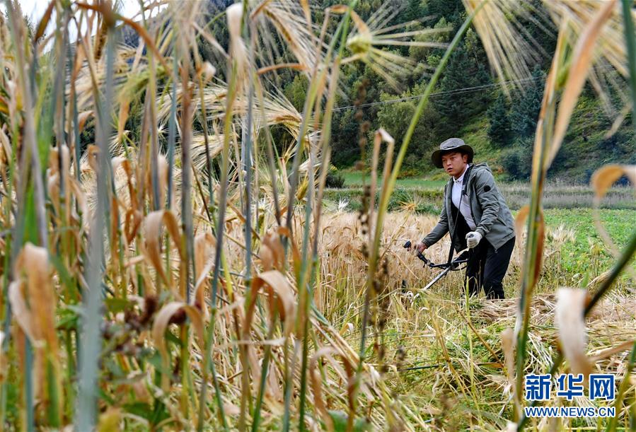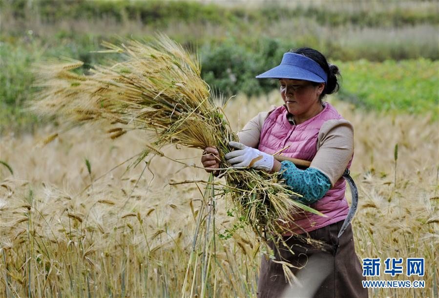 9月20日,昌都市江达县江达镇岗达村农民在收割青稞。