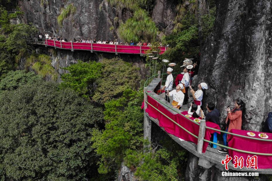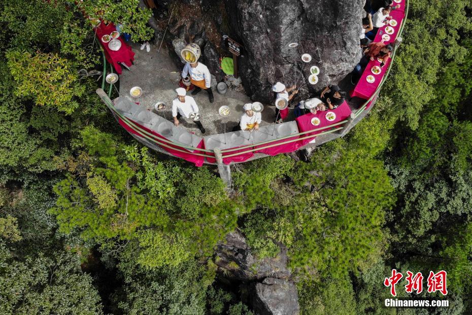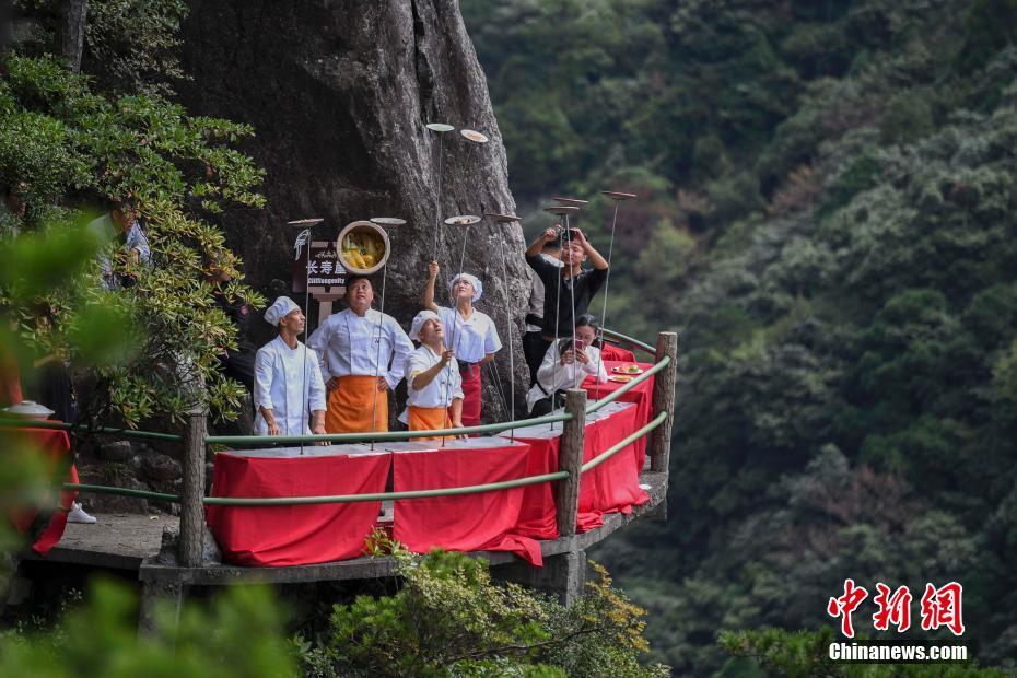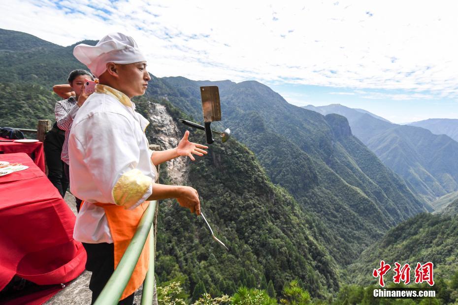 9月27日,长三角第一高峰浙江龙泉山的厨师们,在平均海拔1600余米的悬崖餐厅上展示了倒立切菜、悬崖转盘、绝壁顶缸等拿手绝活,吸引众多前来的食客。 杨勇 摄