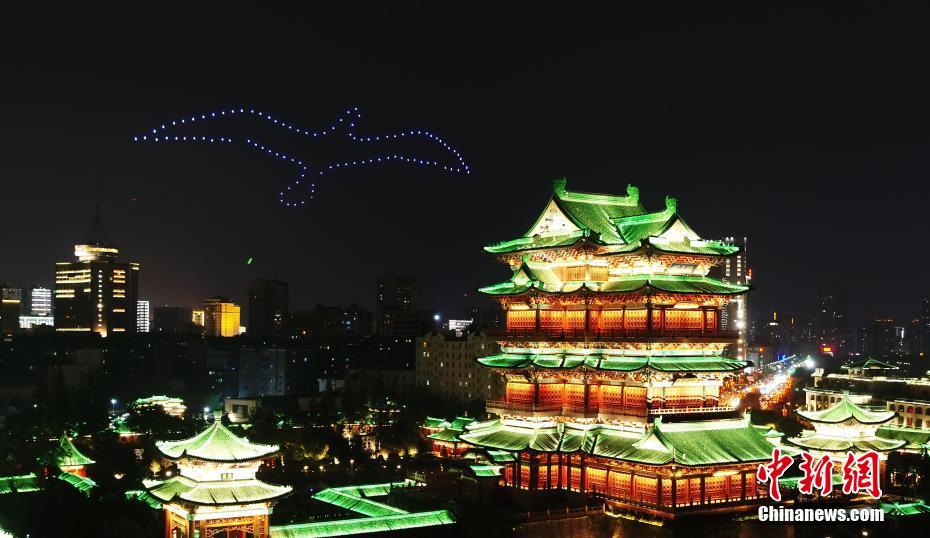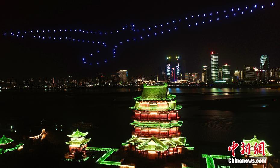 在滕王阁仙鹤雕塑上空,无人机组成的3D立体图形犹如羽冠。 刘占昆 摄