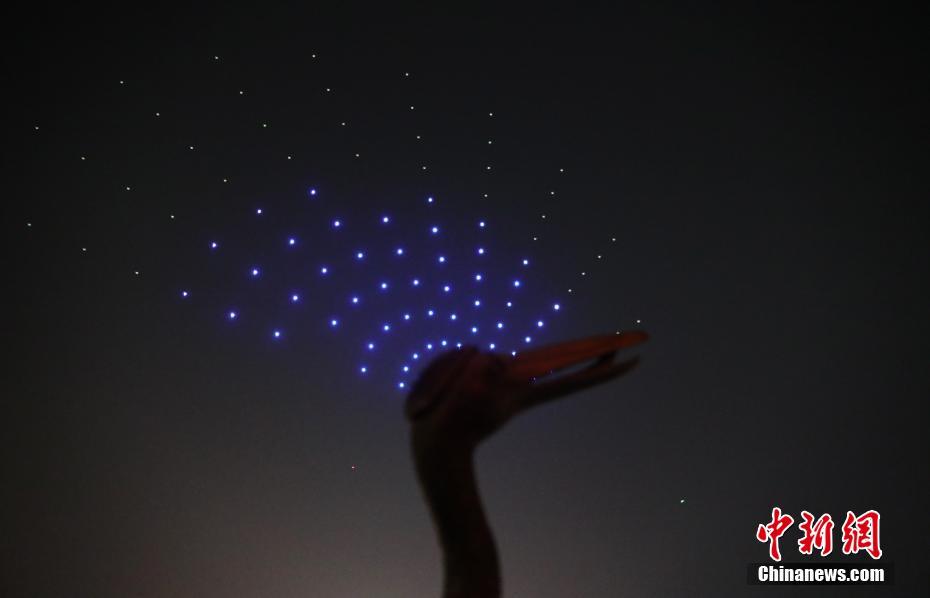 图为百架携带LED灯的无人机组成的“孤鹜”动态图形。 鲍赣生 摄