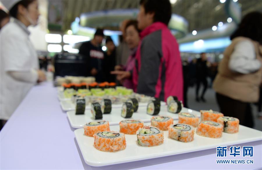 10月10日,用优质稻米制作的寿司在现场展示。新华社记者王凯摄