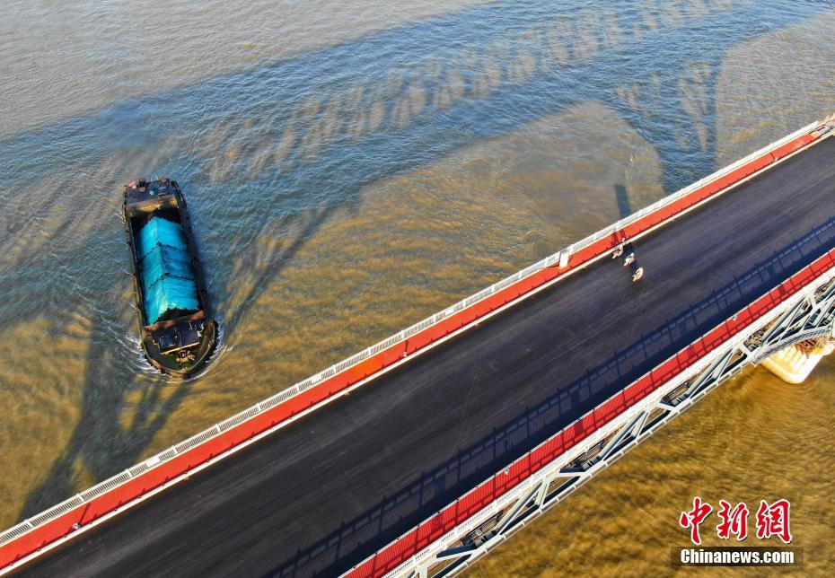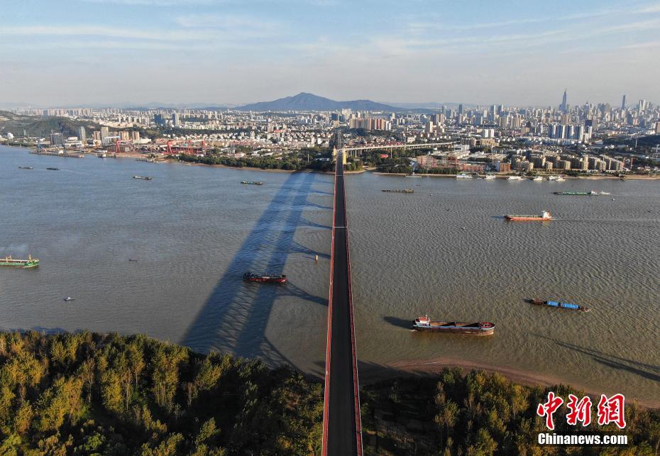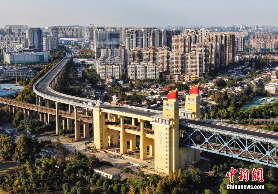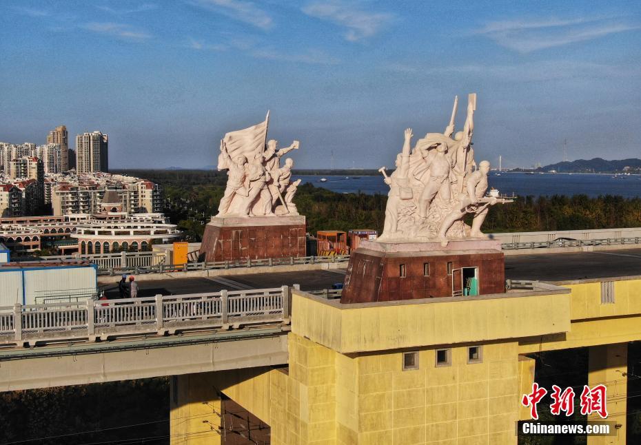 10月18日,航拍封闭维修中的南京长江大桥。日前,正在进行维修改造工程的南京长江大桥主桥桥面摊铺沥青,桥头堡及雕塑等处的围挡也已拆除,露出崭新的形象。据悉,整个维修改造工程预计2018年年底前完成并恢复通车。中新社记者 泱波 摄