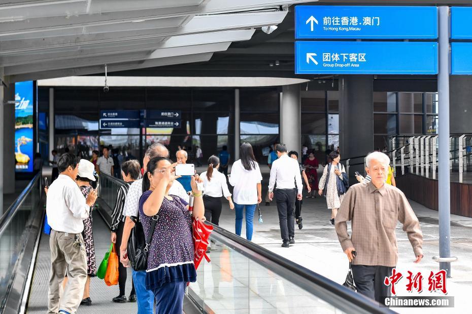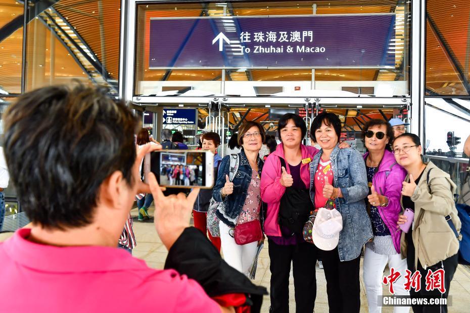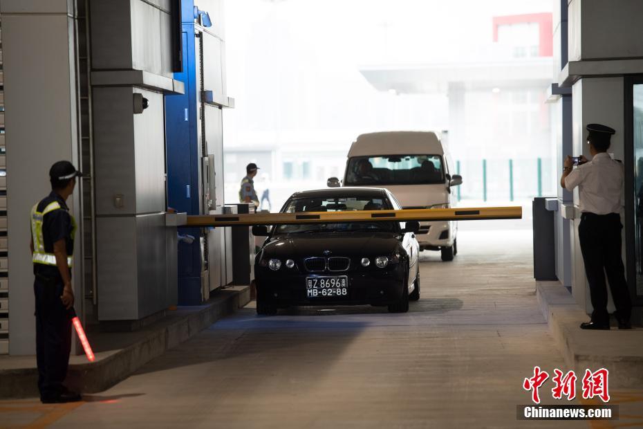 随着澳门口岸离境车道闸口开杆放行,首辆私家车驶过关口,港珠澳大桥正式通车运营。中新社发 钟欣 摄