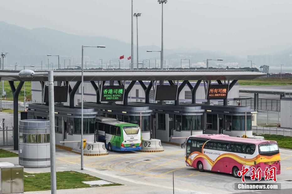 随着澳门口岸离境车道闸口开杆放行,首辆穿梭巴士驶过关口,港珠澳大桥正式通车运营。中新社发 钟欣 摄