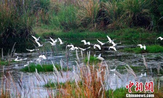 长江一级支流黄柏河生态美景:粉色湿地白鹭翩飞