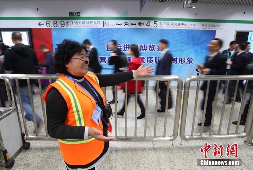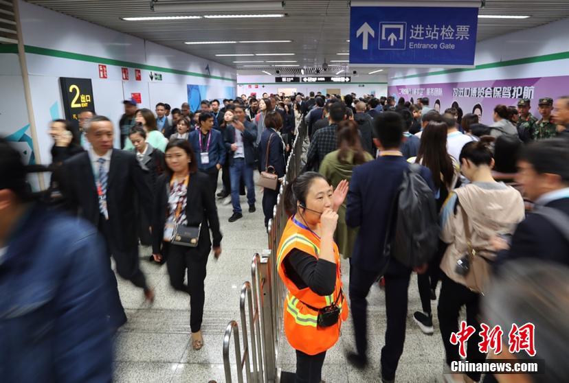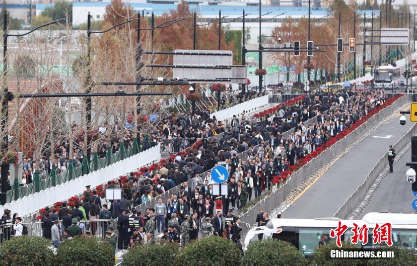 11月6日上午,首届进博会开幕第二日,入馆处人潮涌动,迎来人流高峰。场馆外众多参展商、专业观众沿着蛇形通道抵达国家会展中心。在地铁主要出入口,工作人员疏通人流,保障现场安全。中新社记者 张亨伟 摄