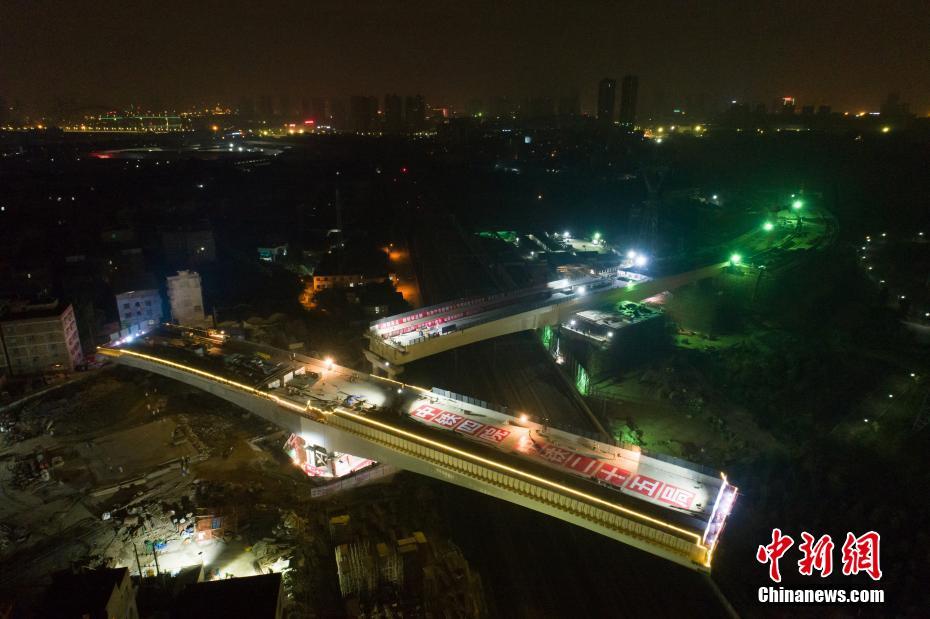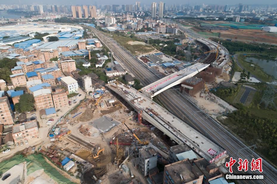 11月7日,国内转体角度最大、国内最小曲线半径转体跨高铁桥梁——广西南宁市亭洪路延长线上跨铁路立交桥右幅成功转体110度,与此前完成120度转体的左幅主桥顺利“合体”。据介绍,该桥先后刷新了国内跨高铁桥梁转体角度、最小曲线半径转体2项新纪录。图为转体后的跨铁路立交桥。中新社记者 吴盛洋 摄