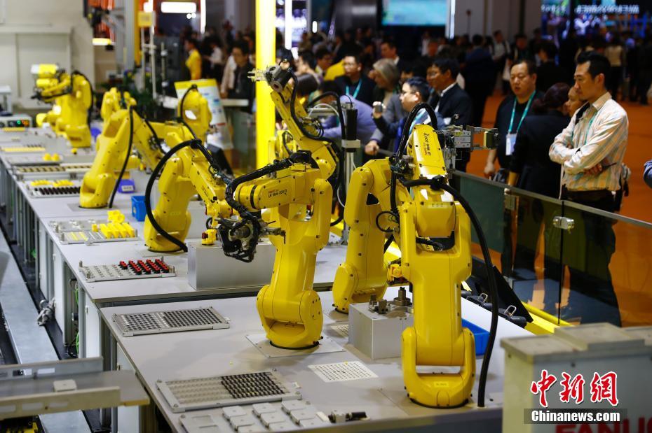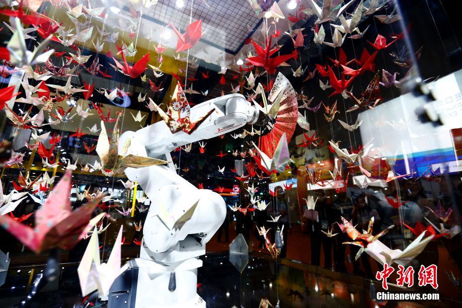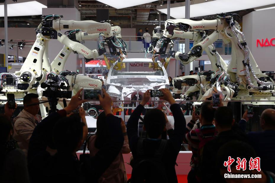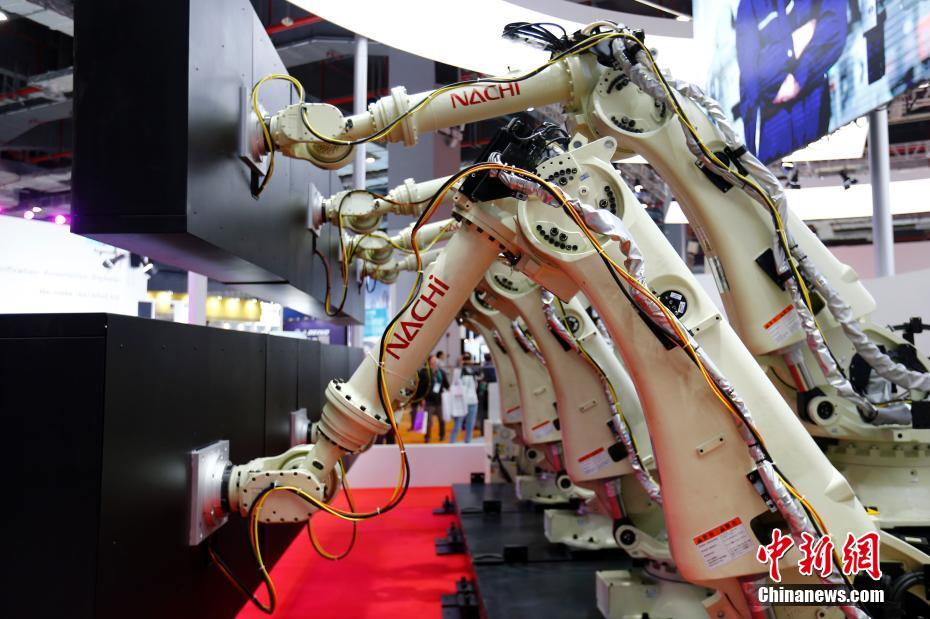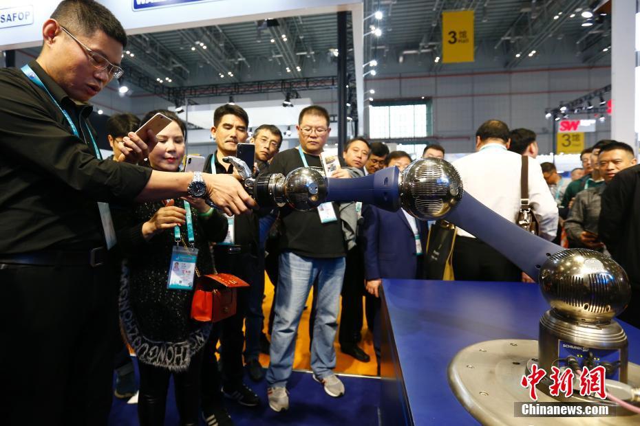 11月7日,在进博会智能及高端装备展区机械手臂吸引参观者驻足。11月5日,首届中国国际进口博览会在上海开幕,来自130多个国家和地区的3000多家企业前来参展。中新社记者 富田 摄