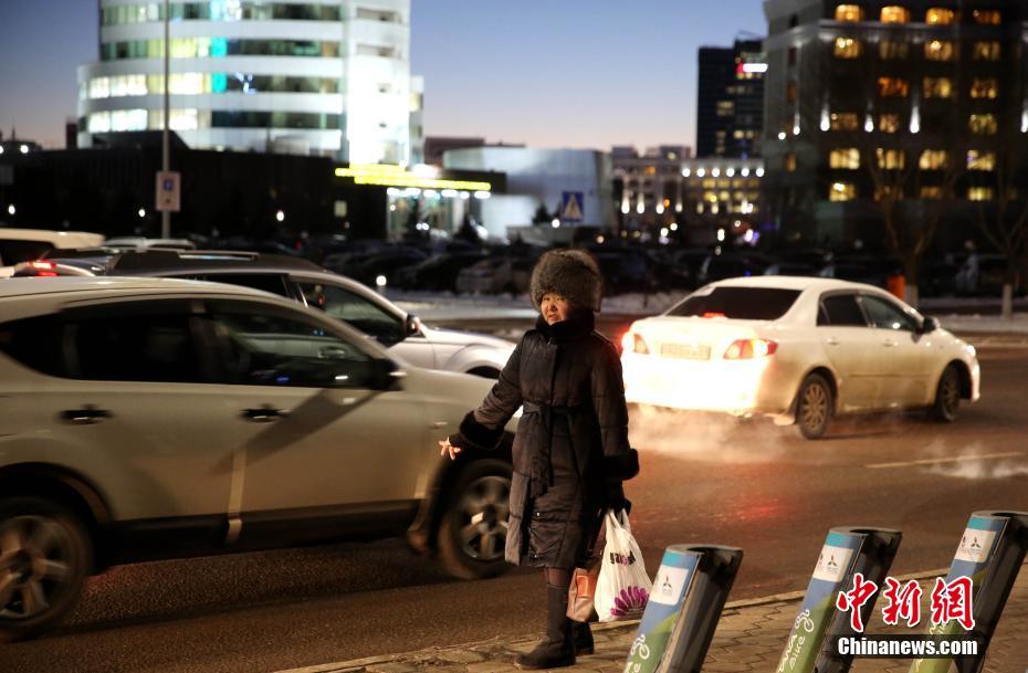 11月15日,傍晚7点钟左右,“冷都”阿斯塔纳已进入“夜景模式”。阿斯塔纳冬日寒冷非常,积雪很快化作坚冰将路面覆盖,冰上行走堪称当地民众必备的生活技能之一。图为行人小心踏冰而行。中新社记者 文龙杰 摄