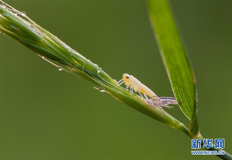 8月7日,一只刚羽化的大青叶蝉在内蒙古呼和浩特市南湖湿地公园的花草间停留。 新华社发(丁根厚 摄)